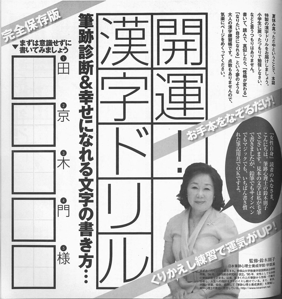 「女性自身」 8月合併号『開運!筆跡漢字ドリル』「筆跡診断&幸せになれる文字の書き方」 ※特別付録 完全保存版 全16ページ解説 2009年8月6日 最終更新日時 : 2025年8月12日 hisseki55 「女性自身」 8月合併号『開運!筆跡漢字ドリル』「筆跡診断&幸せになれる文字の書き方」※特別付録 完全保存版 全16ページ解説(H21年8月発売/光文社)