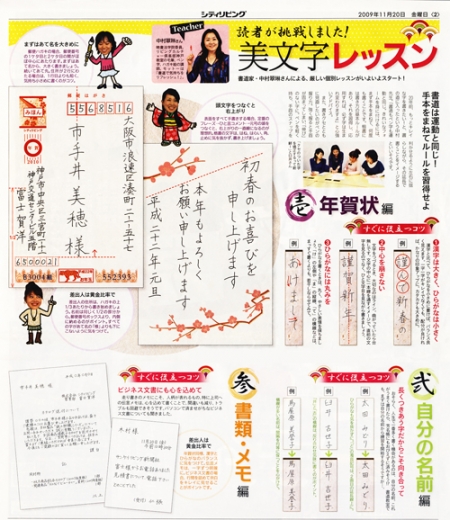 シティリビング 11月20日号「OL美文字練成所」に掲載されました※フロントカラー特集全3ページ 2009年11月6日 最終更新日時 : 2025年8月12日 hisseki55 シティリビング 11月20日号「OL美文字練成所」※フロントカラー特集全3ページ(H21年11月20日号/サンケイリビング新聞社)